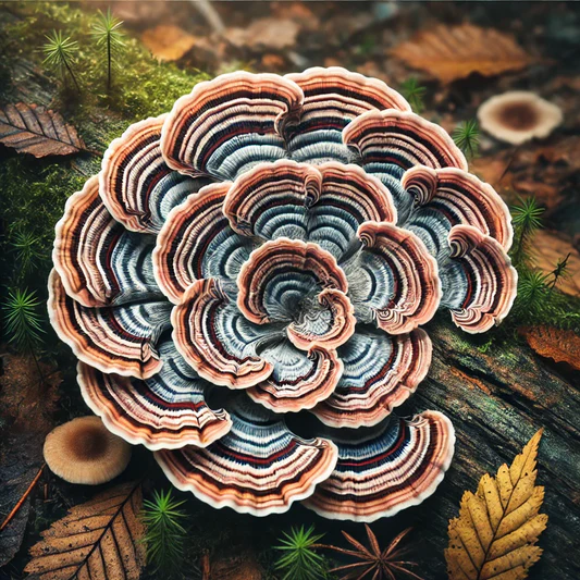 Este hongo, conocido como «cola de pavo» por su forma y color, se encuentra en todo el mundo en troncos de árboles en descomposición.